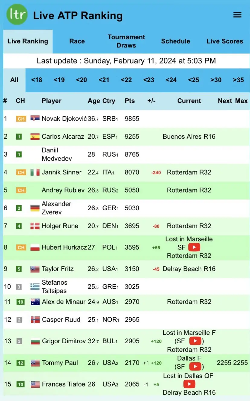 A partire dalla seconda settimana di ottobre 2023, gli aggiornamenti del ranking ATP continuano a generare discussioni tra gli appassionati di tennis. I principali cambiamenti recenti hanno visto l’ascesa di alcuni giovani talenti, mentre grandi nomi del tennis mondiale hanno visto variazioni significative nei loro punteggi.