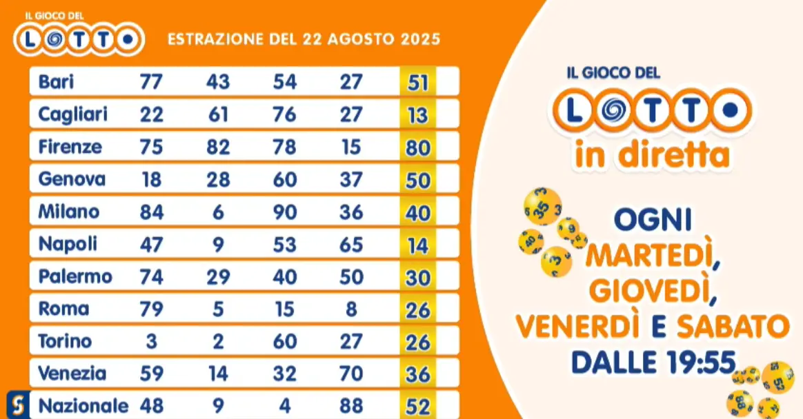 Il 22 agosto 2025, il Lotto ha visto la sua estrazione nel consueto orario serale, con risultati che hanno suscitato grande interesse. I numeri estratti sono stati: 3, 15, 22, 30, 44, 51. Come sempre, i premi variano in base alle modalità di gioco, che includono il gioco del terno, quaterna e cinquina. L’estrazione si è tenuta in un clima di grande attesa, con molti giocatori che si erano preparati anche con sistemi complicati e combinazioni uniche.