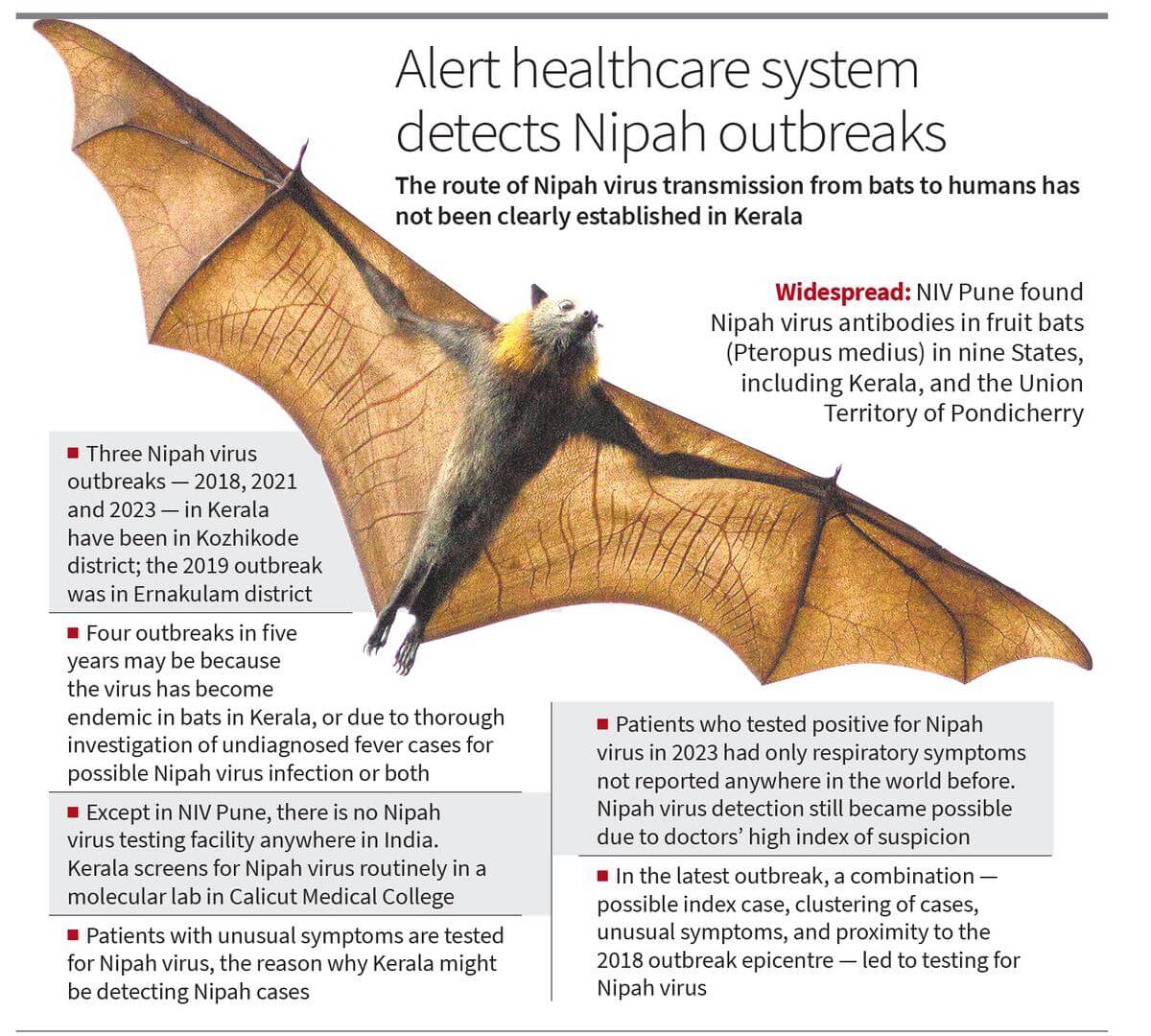 Il virus Nipah è stato inizialmente associato a un focolaio di encefalite tra i contadini di Malesia che si trovavano in contatto con maiali infetti. La trasmissione può avvenire tramite il contatto diretto con animali infetti, come pipistrelli frugivori che sono i serbatoi naturali del virus, oppure attraverso il consumo di frutta contaminata. La trasmissione tra esseri umani è possibile attraverso fluidi corporei, come saliva e urine, e la contagiosità può estendersi rapidamente in contesti di densità abitativa elevata.