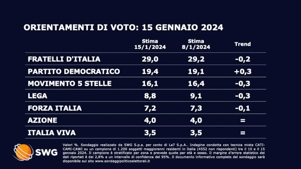 In sintesi, il sondaggio SWG La7 evidenzia un momento di cambiamento nell’opinione pubblica italiana. Gli elettori sono più disposti a considerare nuovi leader e nuove idee in un contesto di incertezze. I partiti politici devono ascoltare questi segnali e adattare le loro strategie, tenendo conto delle esigenze emergenti degli elettori. Le prossime settimane e mesi saranno cruciali per vedere se queste tendenze si confermeranno nei prossimi sondaggi e, infine, nelle urne.